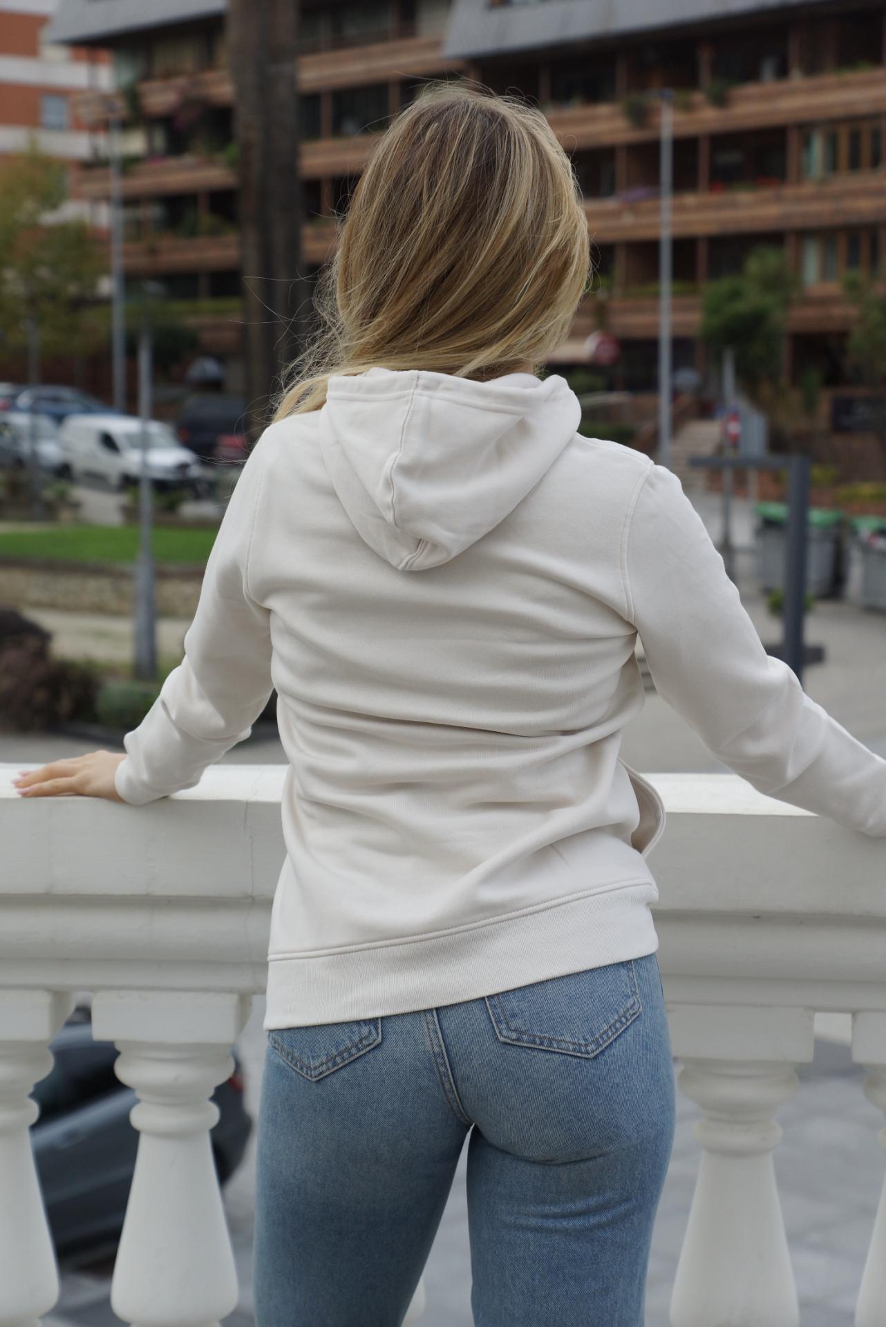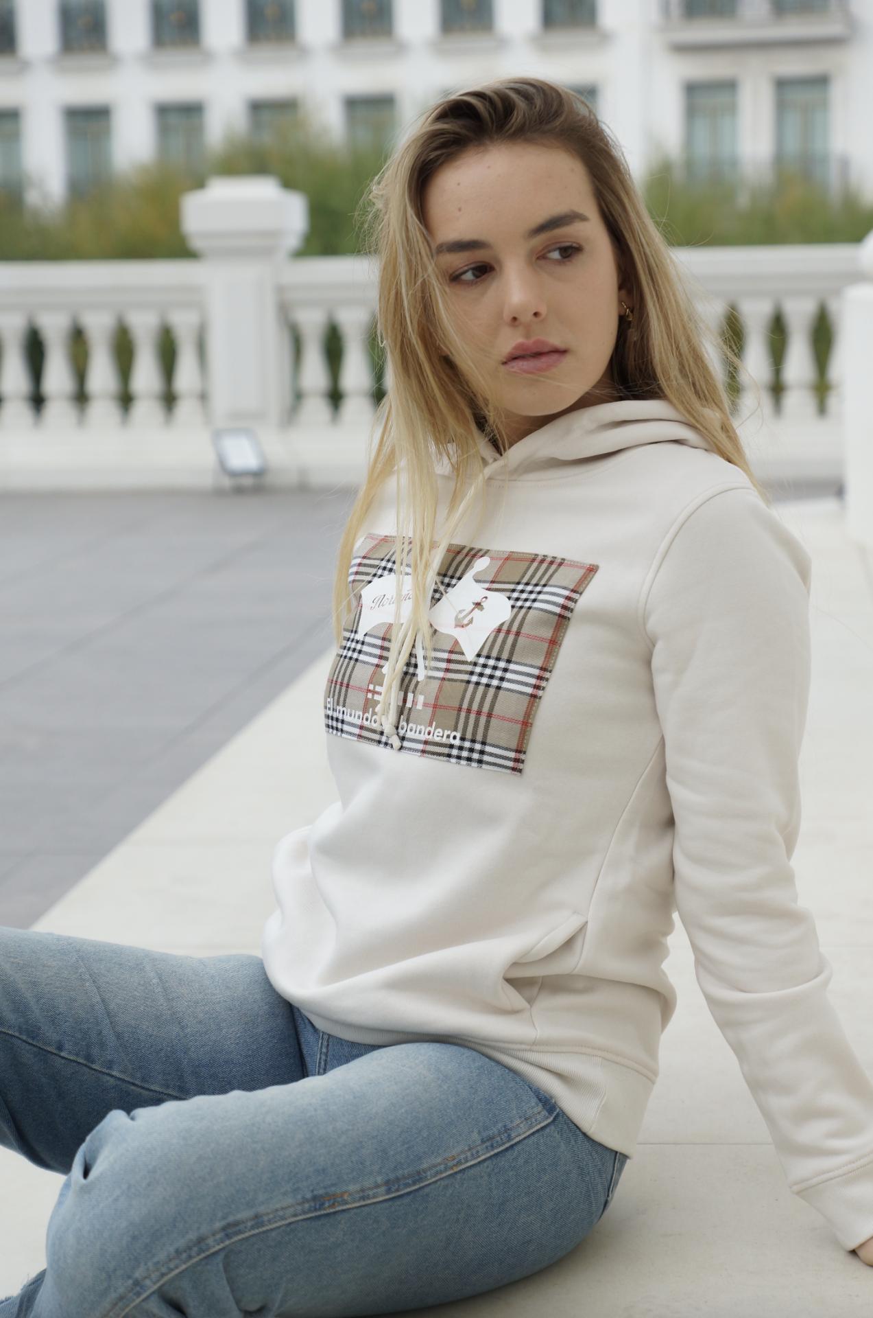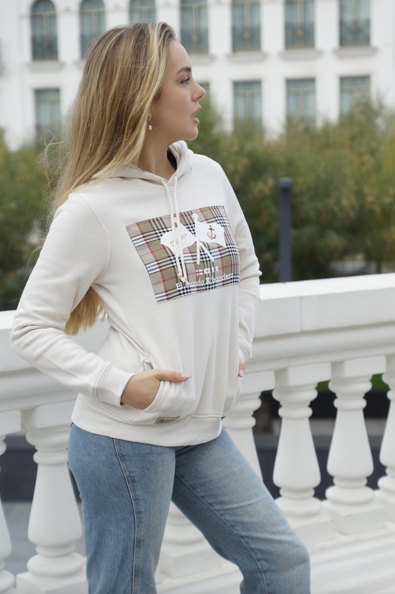 Sudadera de capucha de mujer color banco roto. EL MUNDO X BANDERA